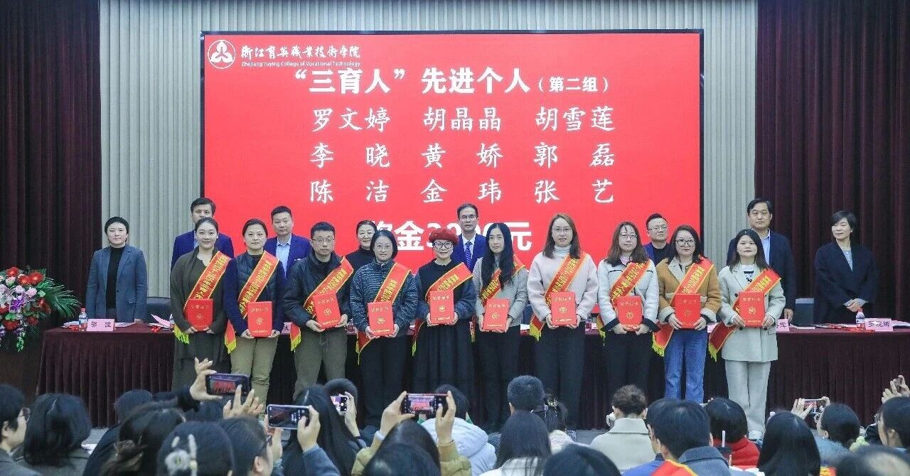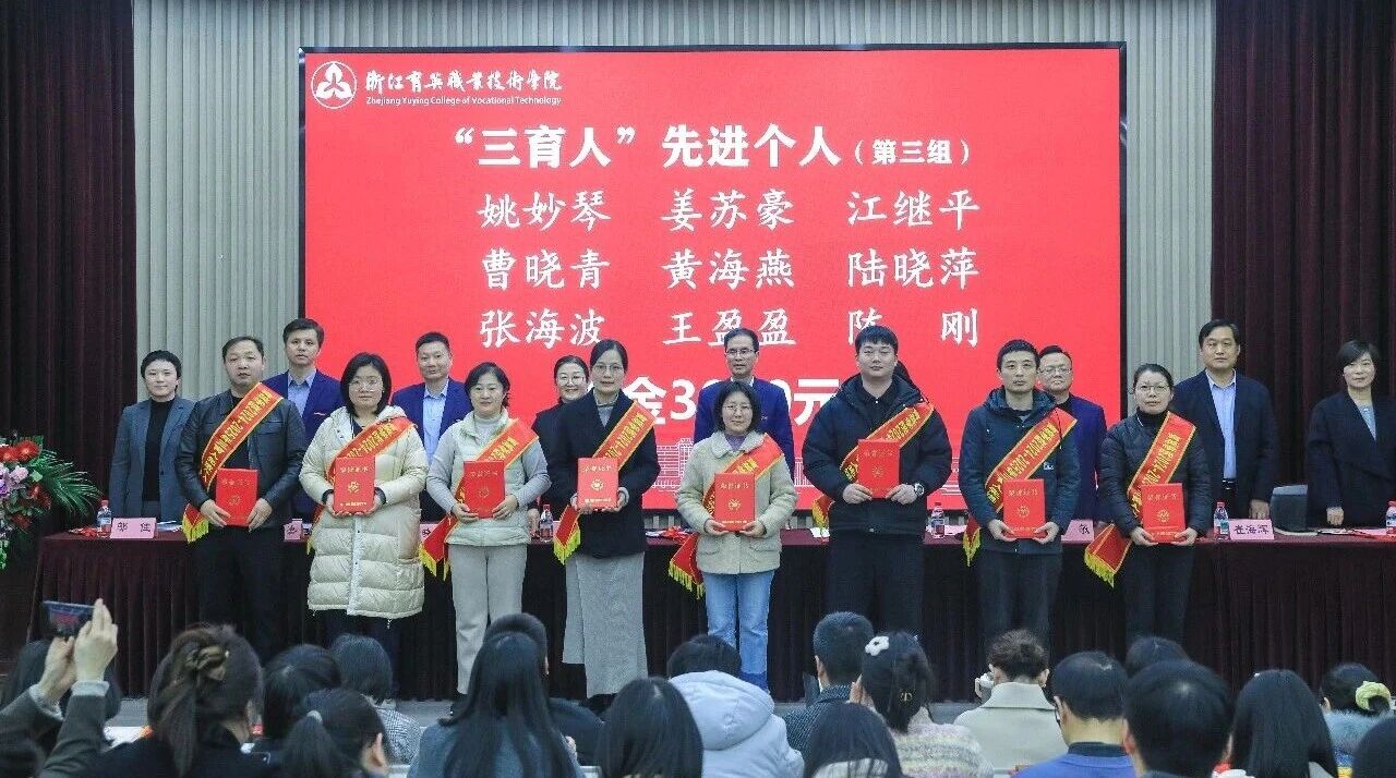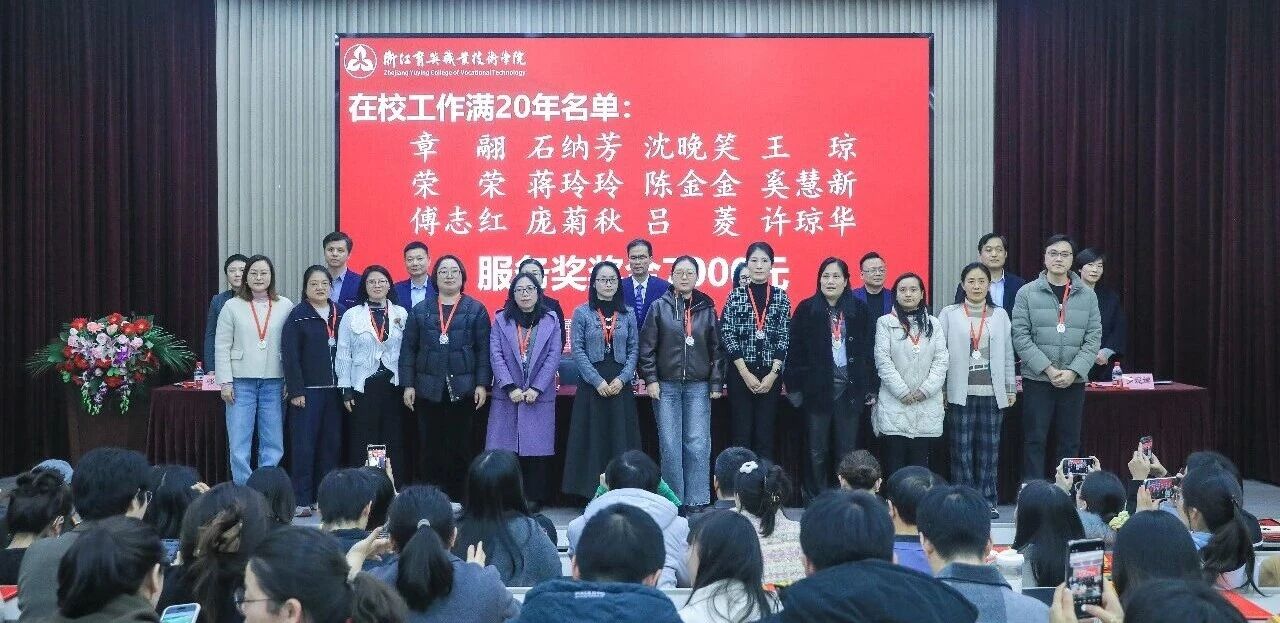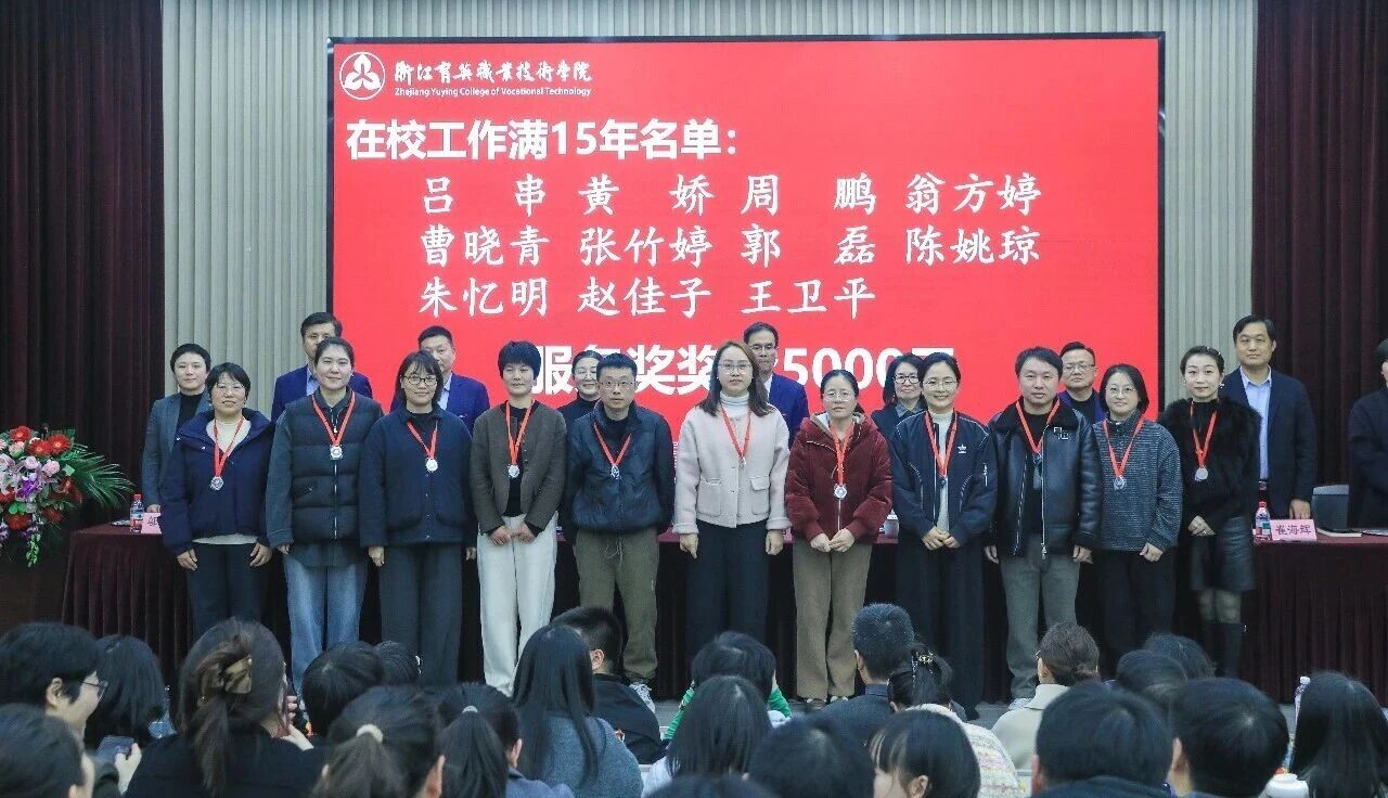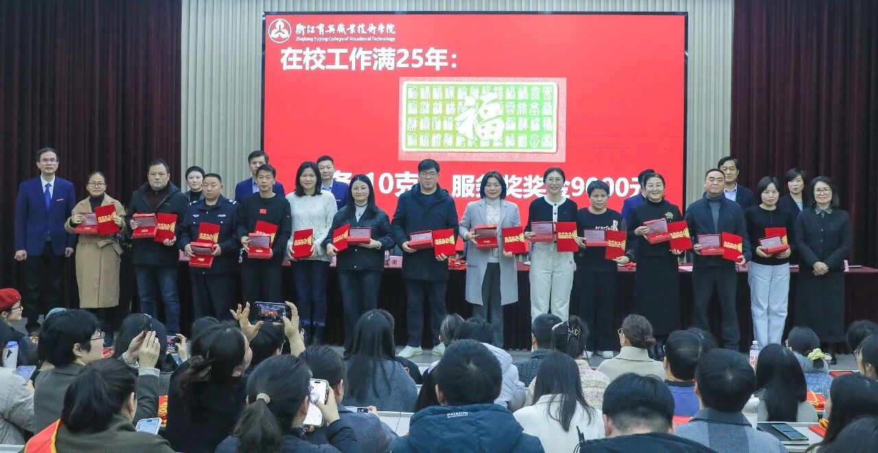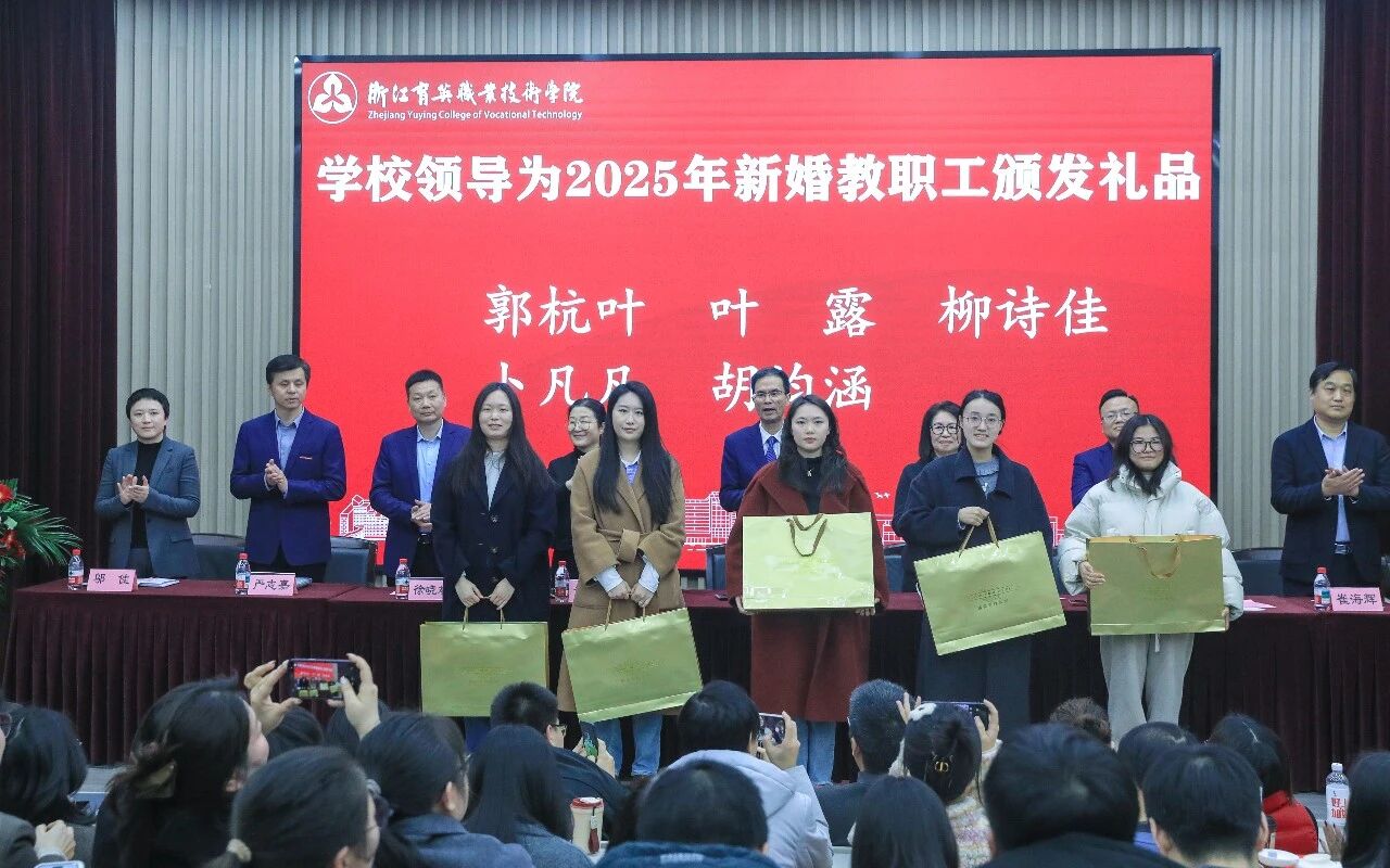谢鑫宣读表彰文件。校外竞赛获奖教师和第二十六届育英优质课堂教学比赛获奖者、学校2024-2025年度“三育人”先进集体和个人受到表彰。校领导为在学校工作满25年、20年、15年、10年和5年的教职工颁发纪念章和纪念盘。校领导为2025年新婚教职工赠送礼品。