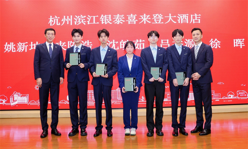 企业导师为“智慧酒店产业学院”第一批学员佩戴徽章并颁发纪念品。