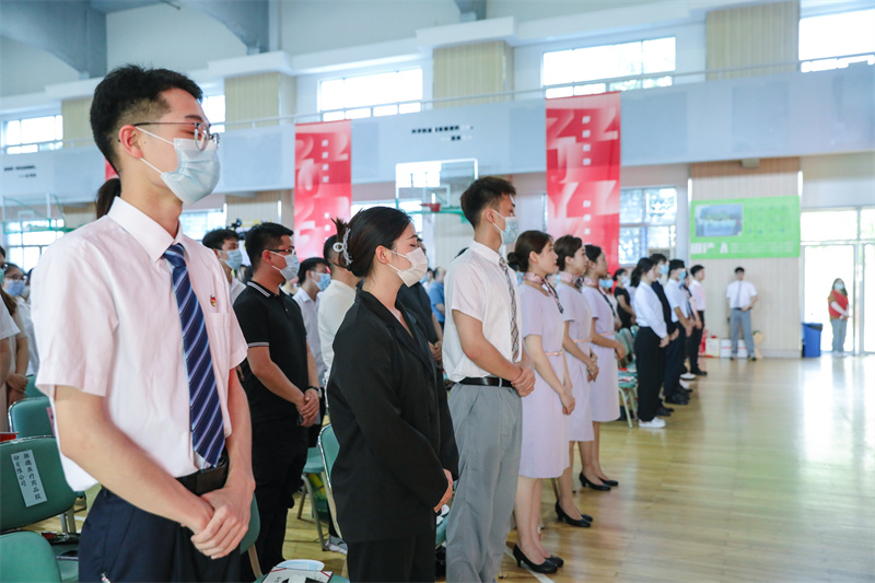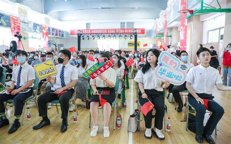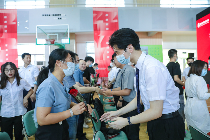 全体毕业生在谢鑫主持下,举行毕业礼,毕业生代表向教职工代表、家长代表、企业代表献花。
