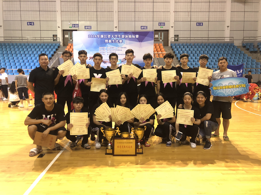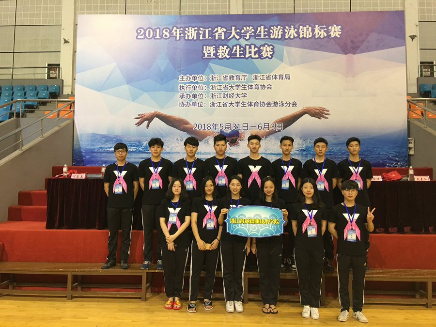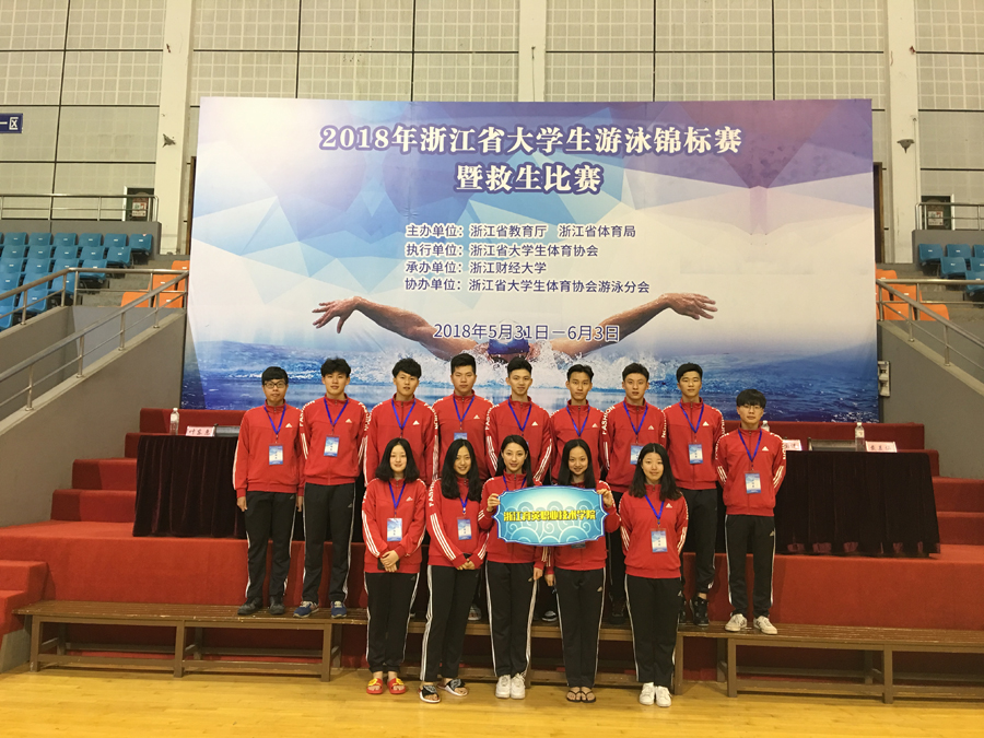 2018年5月31日-6月3日,2018年浙江省大学生游泳锦标赛在浙江财经大学举行,我院游泳队一举斩获7金3银6铜,总团冠军、男团冠军、女团季军,学院获体育道德风尚奖,楼俊毅获“优秀教练员”称号,王雨晶、王雨婷获“优秀运动员”称号。领队徐晓斌、主教练赵佳子、教练员楼俊毅。