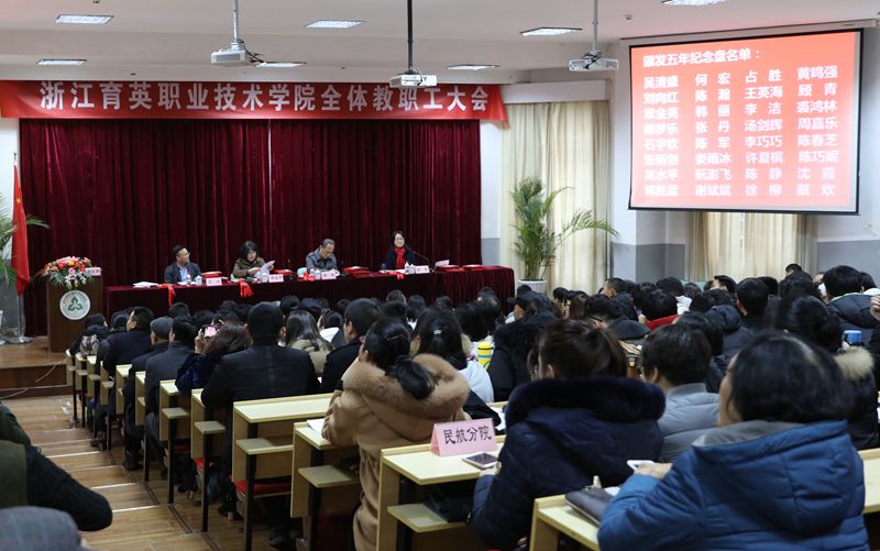 盛健发表讲话。他强调,回顾2017年,学院认真贯彻十九大和全国思想政治工作会议精神,坚持立德树人,全面完成学院人才培养基本任务,2250名学生顺利毕业,人才培养合格率96.1%,总体就业率98.81%,创业率1.02%,毕业生整体实现合理就业。招生工作全面完成计划任务。专业课程建设、教育教学、社会服务、教育国际化等有序推进,并适应新时代发展要求开展积极探索,发展势头良好。2017年,学院先后获得“2014-2015年度全国无偿献血促进奖单位奖”、第二批在杭高校艾滋病健康教育示范基地创建单位;2012-2015年度高校无偿献血爱心集体等荣誉。涌现出2014-2015年度全国无偿献血奉献奖“金奖”、浙江省人民政府授予的无偿献血“之江杯奖”获得者胡岳辉,浙江省师德先进个人汪迎春,杭州市师德标兵季勋龙,全国民办高校优秀辅导员沈霞等先进典型。师生校外竞技比赛形势喜人。截至12月,2017年师生校外竞技比赛获奖情况,参赛获奖80项,获奖学生469人次,优秀指导教师和教师本人参赛受到学院嘉奖237人次。2017年,学院实现全年工作平稳、有序、健康发展。