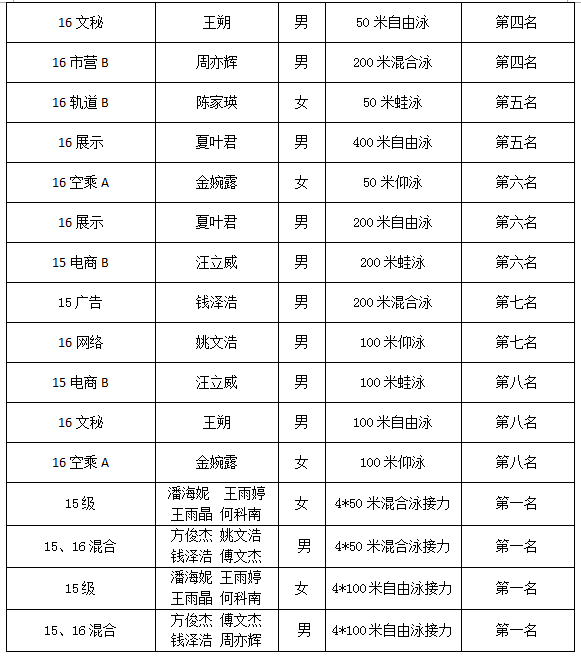 2017年5月19日-20日,2017年浙江省大学生游泳锦标赛在浙江财经大学举行,我院游泳队精神饱满、奋勇拼搏,经过激烈的角逐,斩获11金5银2铜,荣获总团冠军、男团冠军、女团亚军,学院获体育道德风尚奖号。教练楼俊毅获优秀教练员称号,潘海妮、方俊杰同学获优秀运动员称号。领队为季勋龙老师,教练赵佳子、楼俊毅、黄中华老师随队指导。