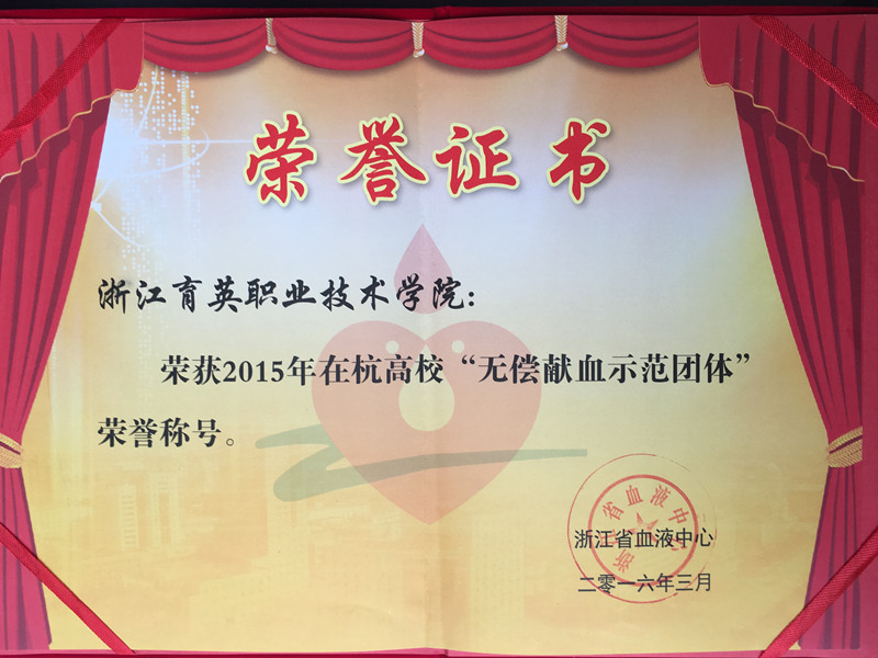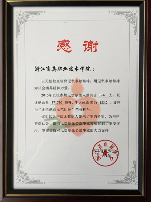 3月18日,2016年上半年浙江省高校无偿献血工作会议在杭州召开。会议表彰了2015年度无偿献血工作各类先进集体。浙江育英职业技术学院荣获2015年浙江省在杭高校“无偿献血示范团体”荣誉称号,为4所在杭高校之一,唯一高职院校。浙江省血液中心向学院颁发感谢信,感谢我院“以无偿献血培育奉献精神,用无偿奉献精神为社会涵养精神力量”。