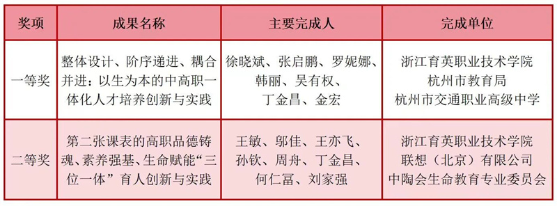 浙江省教育厅公布2025年省教书育人杰出贡献奖(教学成果奖)名单,以育英作为第一完成单位获高职教育教学成果奖一等奖1项,二等奖1项,实现历史性突破。充分展现了学校教育教学改革成效和整体办学实力的显著提升。