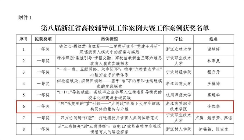 近日,第八届浙江省高校辅导员工作案例大赛获奖名单揭晓。我校获工作案例一等奖1项、三等奖1项。