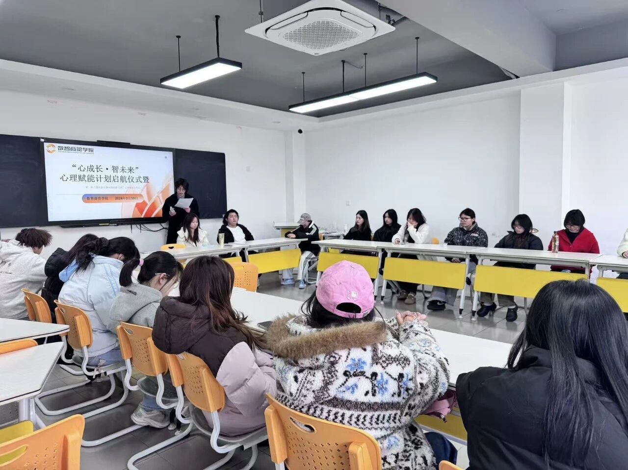 为帮助学生缓解开学焦虑,增强心理委员履职能力,搭建朋辈心理互助桥梁,2026年3月10日 13:30,数智商贸学院心理辅导站在3309教室启动“心成长智未来”心理赋能计划,开展首期“遇见新学期联结新自我”心理破冰工作坊。学院心理辅导站梅青青老师担任活动负责人,全院各班心理委员参与本次活动。