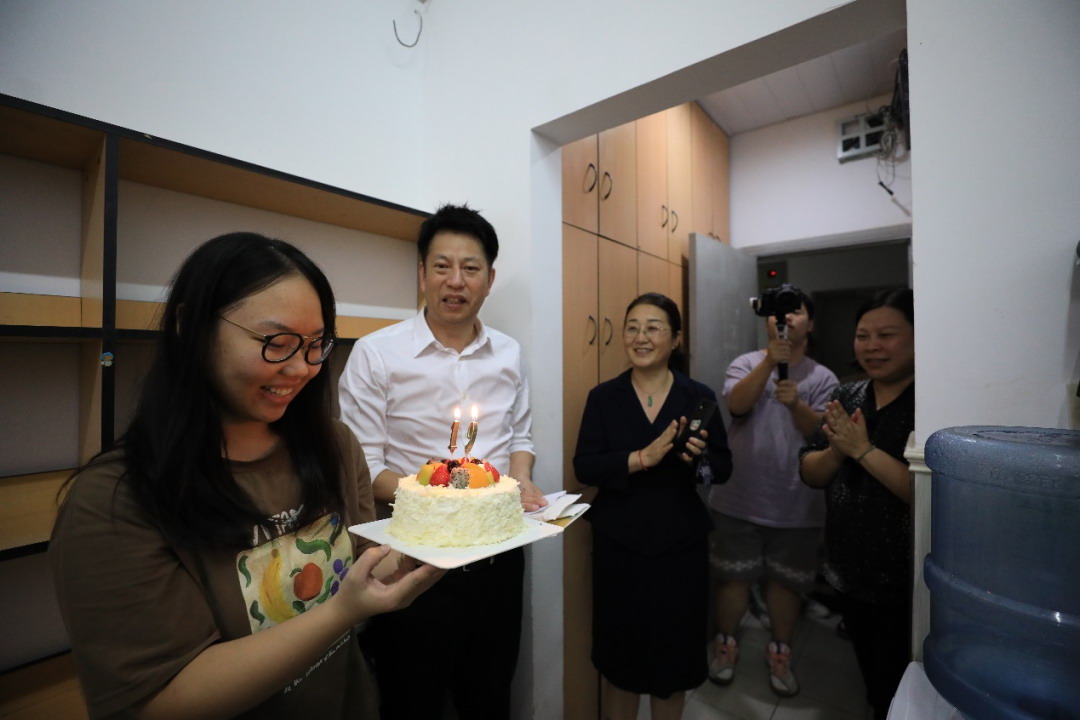 走访当天,恰逢学院2位新生同学过生日,谢鑫书记和商贸学院领导班子来到他们的寝室,一起唱起生日祝福歌,为他们献上香甜的蛋糕和真挚的祝福。大家有说有笑,现场气氛十分温馨感人。