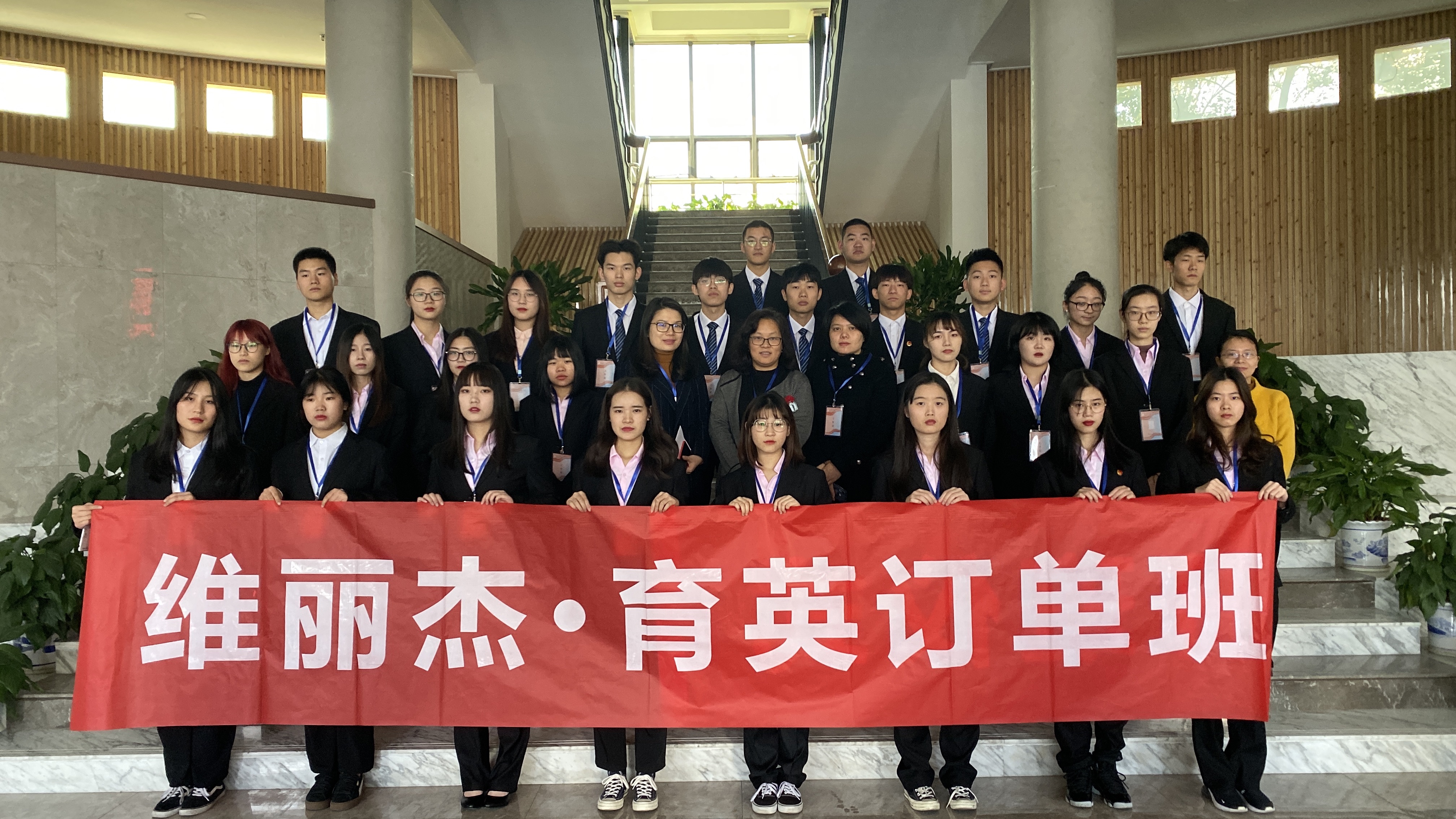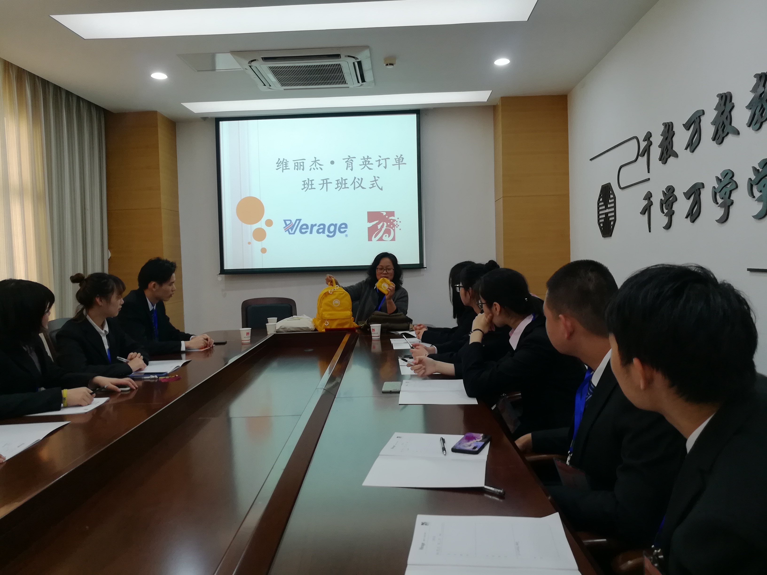 2019年12月10日13:30商务贸易分院的维丽杰•育英订单班开班仪式在跨贸实训基地举行,商贸分院陈贤平副院长、杭州维丽杰旅行用品有限公司总经理朱方芳女士、国贸专业教研室主任傅祝屏老师、专业老师杨芬,以及订单班30位同学参加开班仪式。
