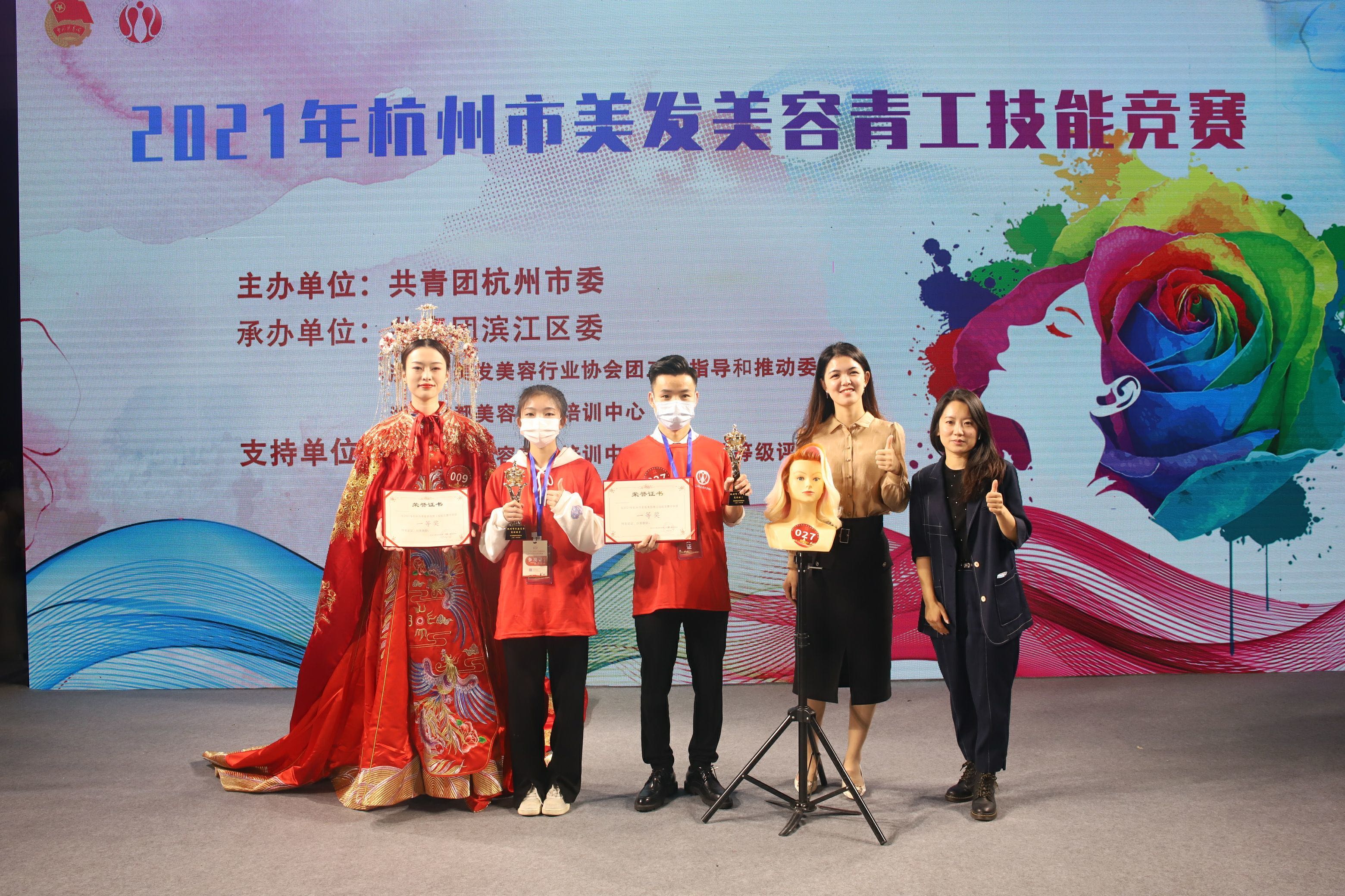 学生薛佳婷(右一)荣获2021浙江省美容美发职业技能竞赛一等奖