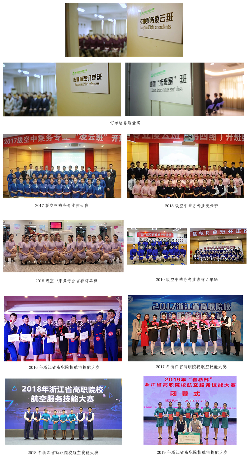 学院与吉祥航空航空公司合作开设“吉祥航空订单班”,与厦门航空合作开设 “厦航未来星班”及相关航空公司预备班,为航空公司培养优秀人才。专业学生连 续四年获得浙江省高职院校航空服务技能大赛一等奖。