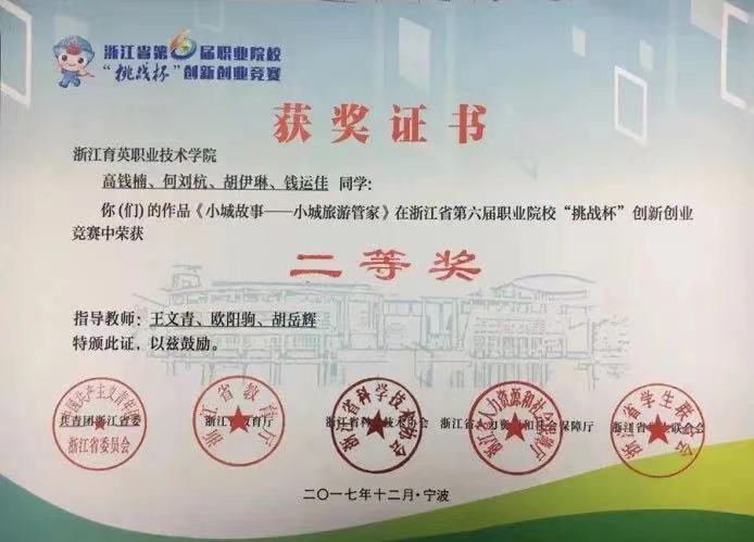 获浙江省第六届职业院校“挑战杯”创新创业竞赛二等奖