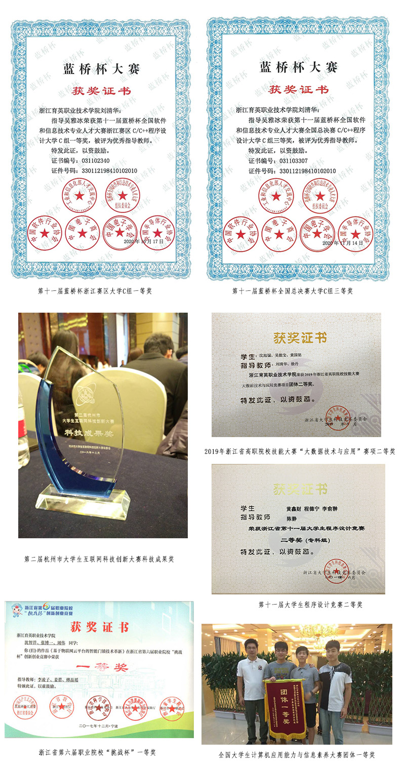 以赛促教、赛教结合是本专业的特色之一。信管专业学生先后获全国大学生计算机应用能力与信息素养大赛中团体一等奖,浙江省挑战杯创新创业竞赛一等奖,浙江省大数据技术与应用竞赛二等奖,全国大学生“互联网+”创新大赛暨第五届“发现杯”全国大学生互联网软件设计大奖赛APP赛项区域赛华东赛区一等奖、全国总决赛二等奖,第十一届蓝桥杯全国软件和信息技术专业人才大赛浙江赛区C/C++程序设计大学C组一等奖、全国总决赛C/C++程序设计大学C组三等奖。
