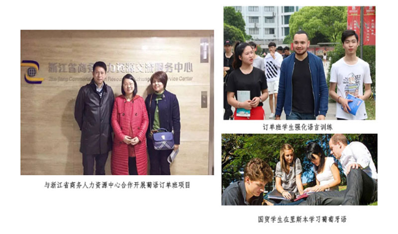 与浙江省商务人力资源服务公司合作共办葡萄牙语订单班,专业学生经过一年的葡萄牙语培训有机会前往葡萄牙里斯本大学就读本科提升学历,也可以到安哥拉、巴西等葡语国家从事国际贸易工作