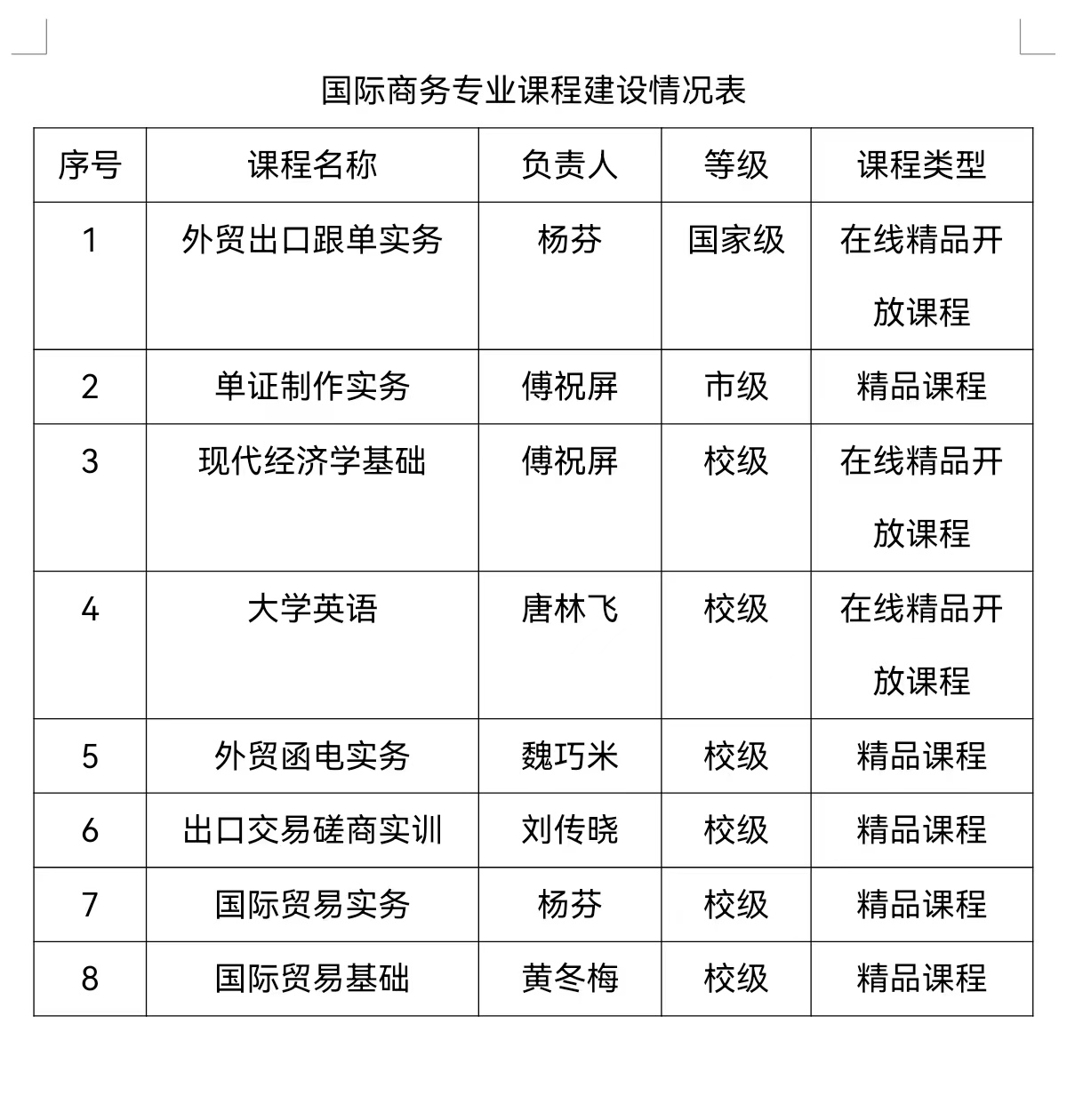 专业构建了基于外贸岗位工作流程的课程体系,建成了有一定特色的省级、市级、校级校企合作、产教融合的精品课程,涵盖了专业主要核心课程,课程资源开放共享,满足学生