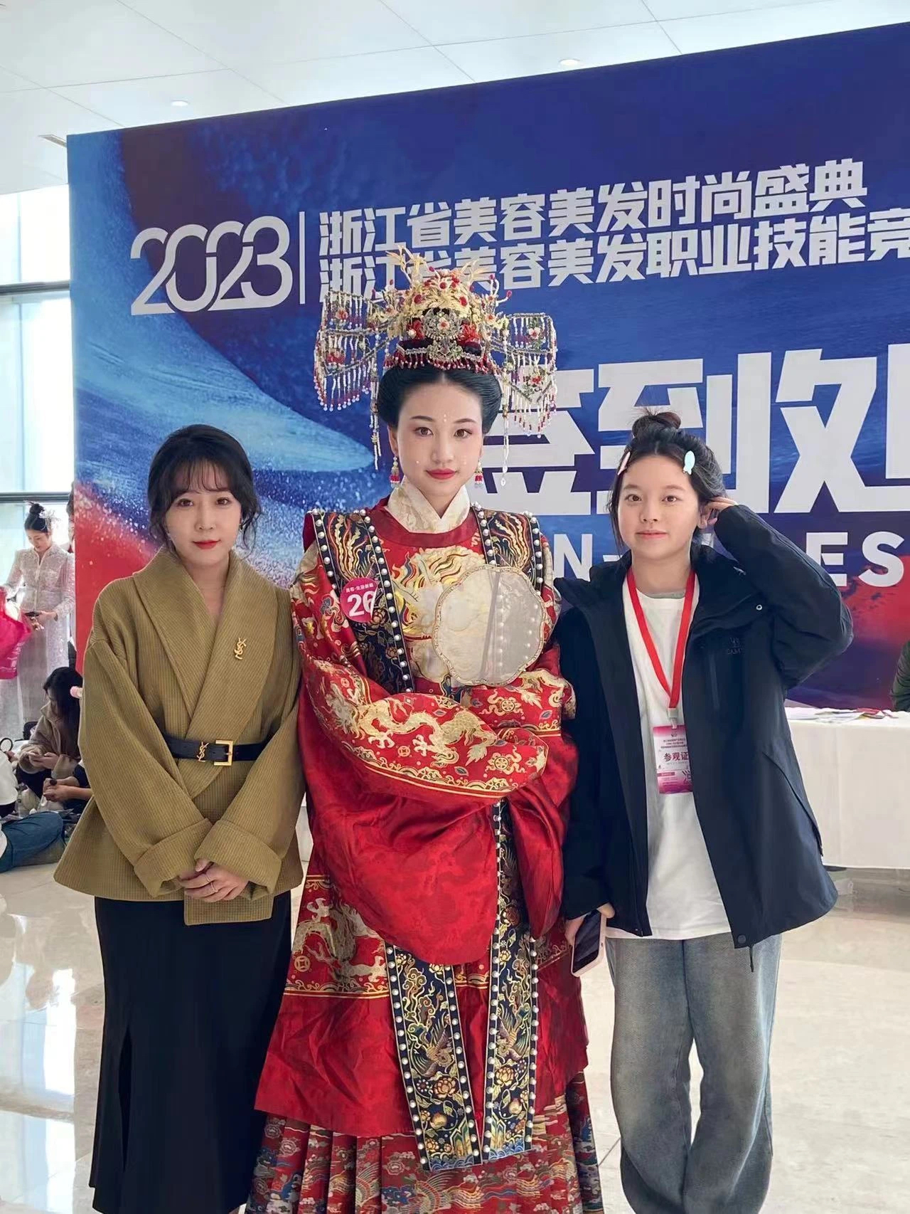 学生钱梦涵(右一)获2023年浙江省美容美发职业技能竞赛生活新娘化妆学生组二等奖