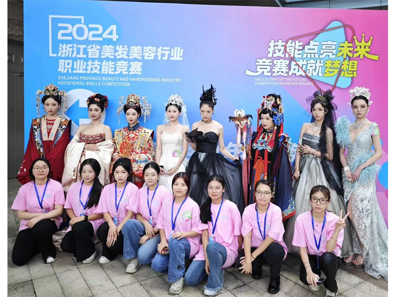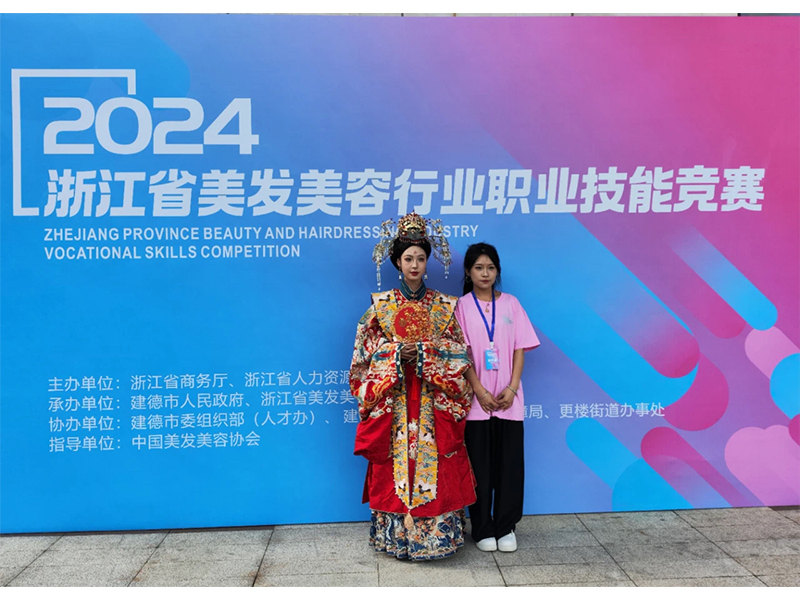 学生叶爽(右一)获得2024浙江省美容美发职业技能竞赛新娘组一等奖