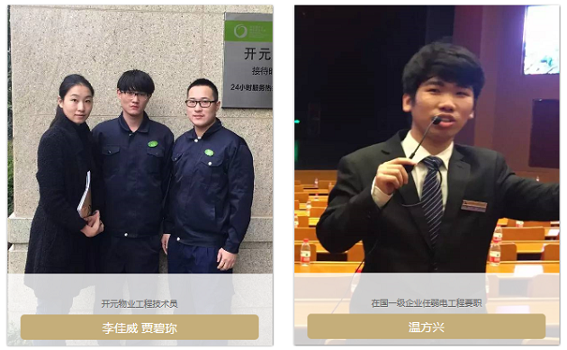 2017年,参与订单的物管企业共有12家,全都是国家一级资质物管公司。大二学生100%被企业预订,学生在大三顶岗实习阶段,就直接带薪进入企业学工兼修。如:南都物业的“三年雏鹰培养计划”;高力国际的“金牌物业管家培养方案”等,让物管专业的学生们对未来的职业规划,充满着成就感和美好憧憬。