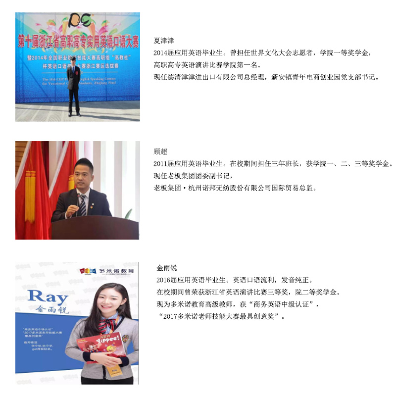 专业教学注重培养学生的语言运用能力,注重“以赛促教、以赛促学”,带领学生在各类英语技能大赛中取得骄人成绩。竞赛促使学生大胆开口讲英语、方方面面用英语,快速提升学生的英语表达能力。