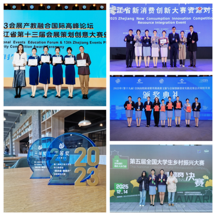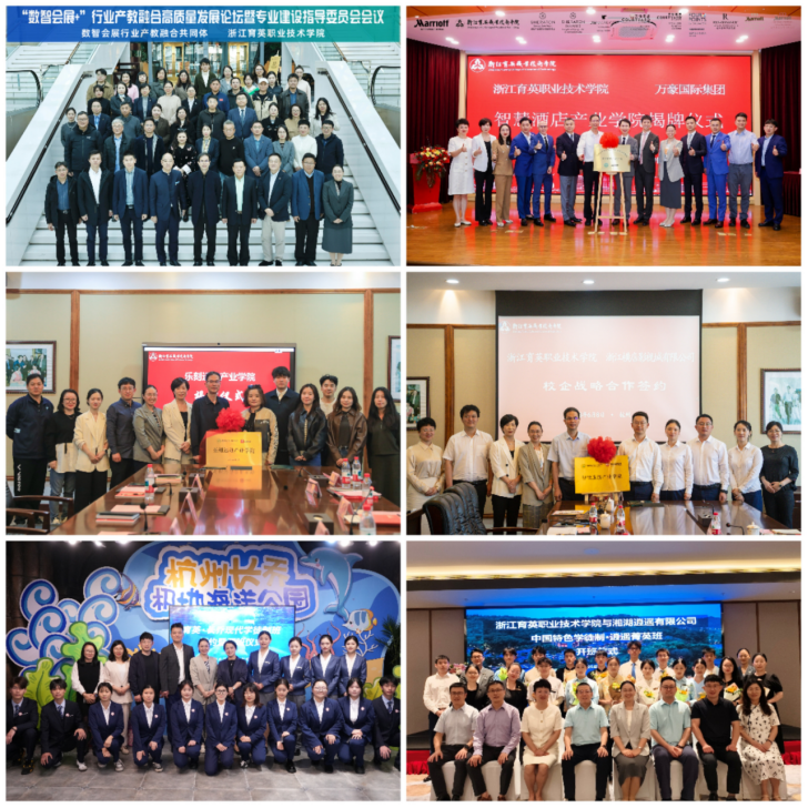 学院与 60 余家龙头企业深度合作、互利共赢,为人才培养搭建起多层次、立体化的实践平台,核心平台涵盖四大类:一是牵头组建杭州市"数智会展行业产教融合共同体"、"数字会展技术创新中心"、"乡村振兴高校工作站"等载体,通过"政校行企园"五方联动,构建协同育人新格局;二是与头部企业共建"横店影视产业学院""万豪产业学院""乐刻运动产业学院" 等特色产业学院,实现专业与产业精准对接;三是开设"万豪匠心班""逍遥菁英班""新世界研学班"等中国特色学徒制班,定向培养岗位适配型人才;四是联合中职学校、行业企业组建一体化产教融合联盟,共建共享校外实训基地。