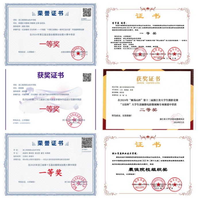 学院成立文旅竞赛导师团,制定竞赛管理办法,组织"班级-学院-学校"的阶梯式选拔赛制,学生竞赛氛围浓厚,赛事覆盖率达100%,参与省一类及以上赛事15项。近三年,学生因赛事成绩获省政府奖学金65人次,主要获奖如下: