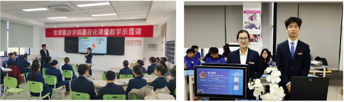 学院紧扣真实岗位与真实项目精心设计人才培养方案,依托文旅产业链构建 "专业分方向、职业分岗位、学生可选择"的课程体系,以数智赋能重构课程内容,核心就是"让课程跟着岗位走、实践贴着产业转"。课程建设注重数字化融合与真实场景植入,全程践行"岗课赛证" 综合育人理念:"岗"上,与 JW 万豪、洲际、杭州国博、乐刻运动等头部企业共定标准,以岗定课;"赛"上,将专业竞赛标准与内容融入日常教学,以赛导课;"证"上,融通定制旅行管家实务、前厅运营管理、会展管理、全媒体运营师等职业资格证书,以证验课。同时,学院深化教学改革,推行"做教学一体、师-AI -生协同"的课堂模式,现已建成省级课程思政课程2门、省级一流核心课程1门、市校级重点课程8门。
